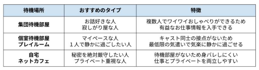 応募するお店で迷ったら、自身の心地よい待機方法が、コミュニケーション重視なのか、プライバシー重視なのか、個人情報重視なのかを考えるとよいかもしれません。
